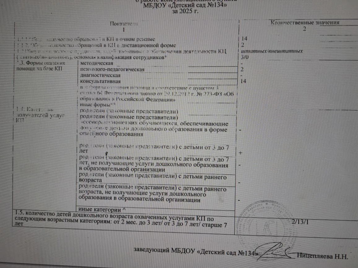 Отчет о работе консультационного пункта МБДОУ “Детский сад №134” за 3 месяца (январь-март 2025)